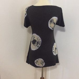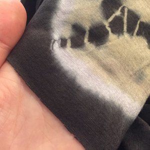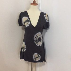 This is a brand new LOVE TANJANE Shirt. V-neck, intentionally raw edges. Dark charcoal gray with tan print on it. Soft and stretchy material. Measures 17 inches across the bust and is about 26.25 inches in length. Made in southern california and hand dyed in ojai. Price is firm. Thanks for looking.