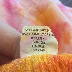 This is a brand new LOVE TANJANE Swimsuit Coverup. White, pink, and orange tie dye pattern. Gauzy material with intentionally raw edges. Measures 22.5 inches across the bust and is about 35.5 inches in length. Has pockets. Made in southern california and hand dyed. Price is firm. Thanks for looking.