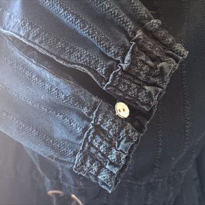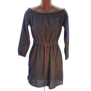 Versatile and comfortable cotton chambray shift dress. Wear on or off shoulder, hip pockets, adjustable drawstring waist.