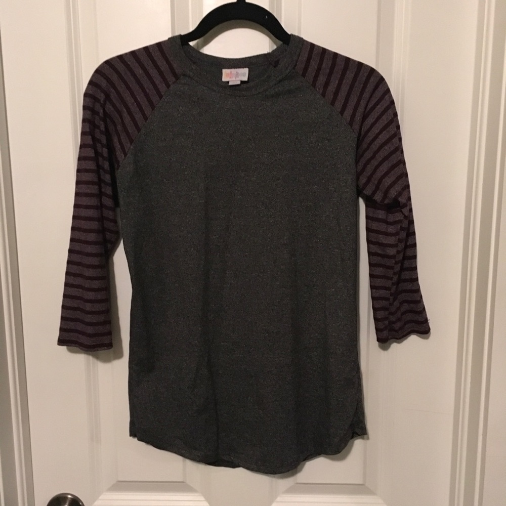 XS LuLaRoe Randy. Gray with purple striped sleeves (maroonish purple, not bright purple). NWOT.