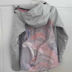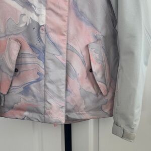 Stylish ski jacket in a blend of gray and pink. Perfect for keeping you warm and fashionable in the winter.