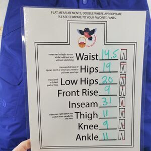 Size XS, flat measurements in photo #3, Women's Fourbarrel Pant in inauguration blue. No stains or flaws noted, besides sharpie on the waistband, lightly used condition.