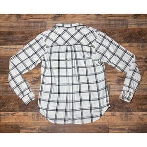 UGG women’s long sleeve pajama top in size XS, featuring a classic white base with black plaid pattern and piping trim. Designed with a button front, single chest pocket, and soft lightweight fabric for all-day comfort. In like new condition.