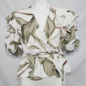 XS X-SMALL Express Faux Wrap Puff Sleeve Peplum Ruffled Crossover Surplice Floral Blouse NWT