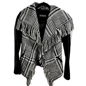 Bold and stylish Guess sweater jacket featuring a houndstooth knit front with dramatic fringe detail and sleek faux leather sleeves. A standout piece that blends cozy texture with edgy design.