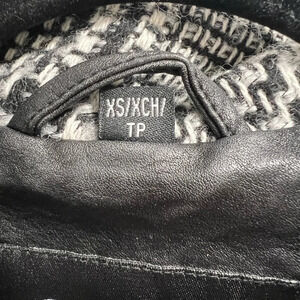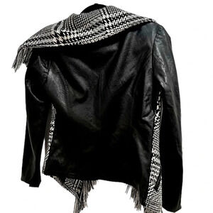 Guess faux leather jacket, fringe sweater coat, houndstooth jacket women, statement outerwear, edgy Guess cardigan