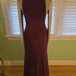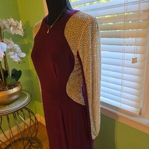 Stunning and elegant evening gown by XSCAPE, new without tags. This floor-length gown is crafted in a deep wine/burgundy stretch fabric that flatters the silhouette. The standout detail is the dramatic sheer mesh sleeves, fully embellished with shimmering rhinestones and pearls for a statement look.