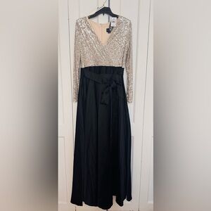 NWT XSCAPE DIXIE V-NECK LONG SLEEVE SEQUIN TOP WAISTBAND WITH BOW GOWN