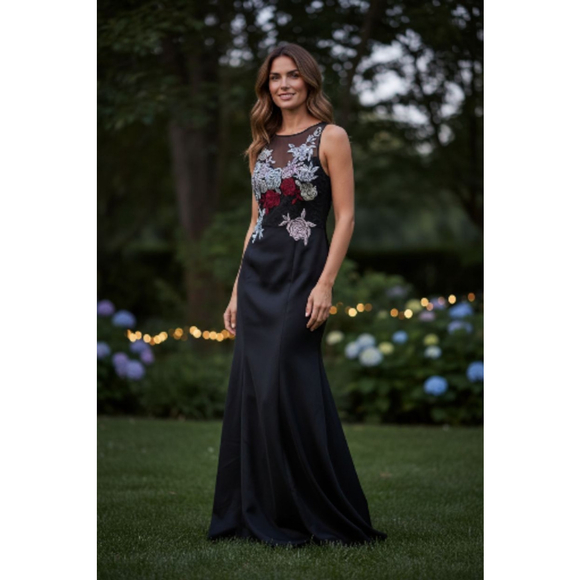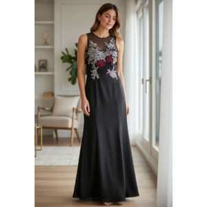 The XSCAPE dress in size 10 is a stylish and elegant option for formal occasions or parties. This sleeveless, bodycon dress in solid black polyester features a zip closure and a long length, making it perfect for summer, fall, or spring events. With a classic and timeless style, this XSCAPE dress is sure to make a statement and turn heads wherever you go. Remember to care for it by dry cleaning only to keep it looking sleek and chic.