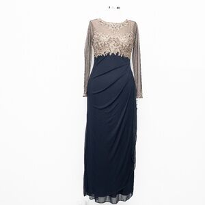Elegant navy floor‑length Xscape gown with a stunning embellished illusion bodice and mesh long sleeves—this dress features a round neckline, back zipper with hook‑and‑eye closure, and exquisitely beaded mesh cuffs. The bodice and sleeves sparkle with intricate adornments, while the skirt flatters with soft ruching and a graceful drape. Crafted from polyester blend, it’s imported and spot‑clean only.