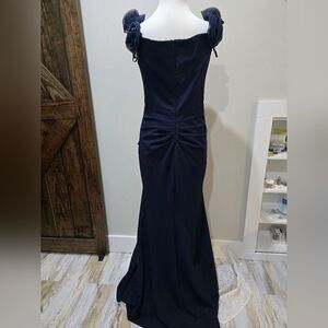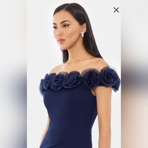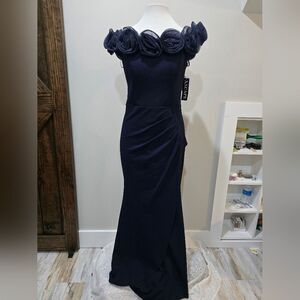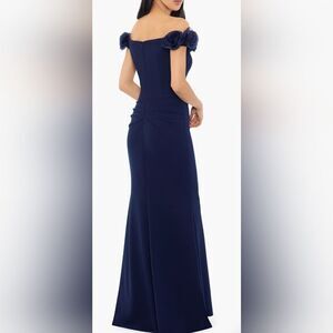 XSCAPE Floral Appliqué Off the Shoulder Gown NWT size 10 Navy Blue