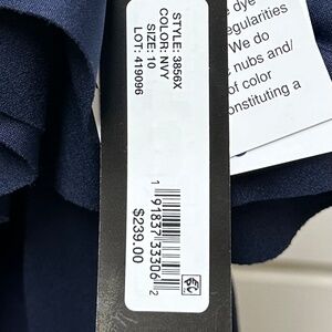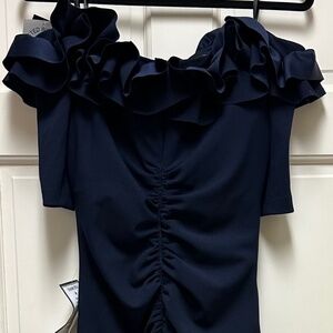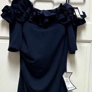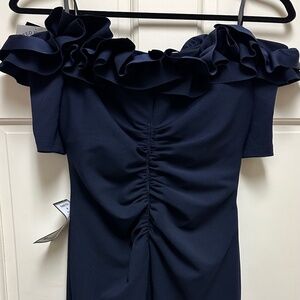 Navy XSCAPE off shoulder long gown, size 10. Ruffle neckline, back zipper, ruching in back around zipper, short sleeve, new with tags, retail $239.