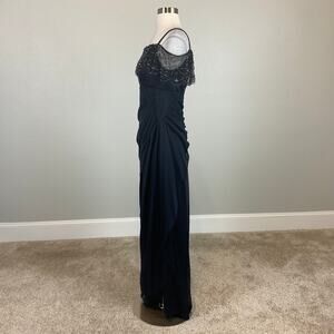 ~ Short, off the shoulder sleeves~ Straight neckline ~ Spaghetti shoulder straps ~ Ruched at back and side ~ Cascading ruffle at side ~ Silver-tone beading ~ Empire waist ~ Long, floor-length hemline ~ Padded bra cups ~ Concealed back zipper with hook and eye closure ~ Fully lined ~ Stretchy polyester