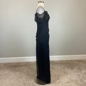 An elegantly beaded tulle overlays the bodice of this stunning evening gown from XSCAPE.
