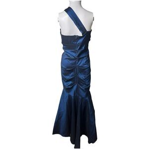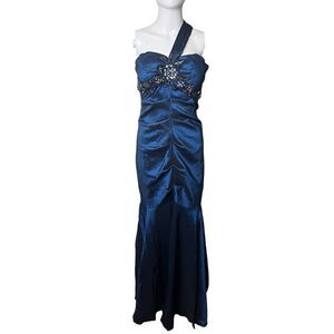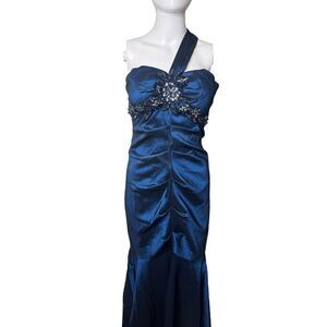 XSCAPE One Shoulder Ruched Full Length Formal Dress Dark Blue Size 10