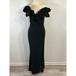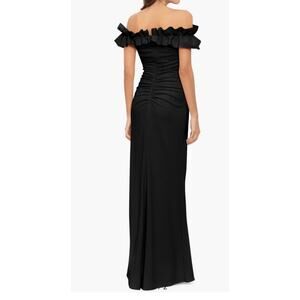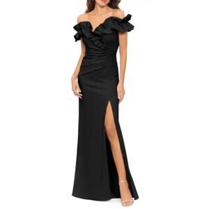 XSCAPE PANDORA RUFFLE OFF THE SHOULDER RUCHED GOWN IN BLACK SIZE 6. NWOT.