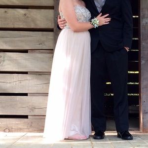 Champagne, strapless dress, fitted sequined top, the bottom flows and it has a little "poof" to it. Size 8 (fits a little small), hemmed for someone 5'2 (worn with flat sandals). Only worn once. If interested, I will have it dry cleaned and shipped to you as soon as possible. Paid around $230 asking $120