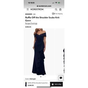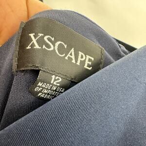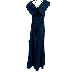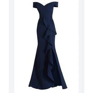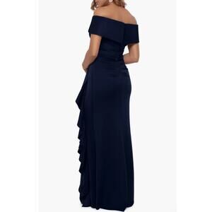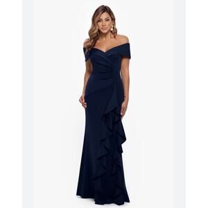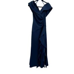 XSCAPE Ruffle Off the Shoulder Scuba Knit Gown Midnight Blue Size 12 NWOT