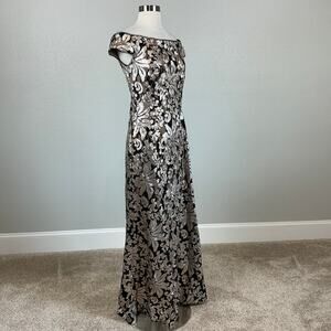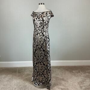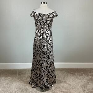 XSCAPE Sequined Off the Shoulder Evening Gown Black and Gold Size 6 Formal Dress