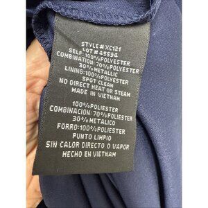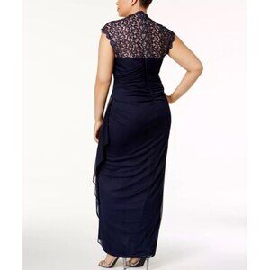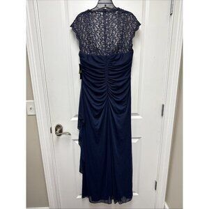 XSCAPE Size 16 Navy Metallic Lace Sleeve Chiffon Ruffled Cascade Gown Dress New