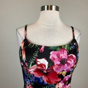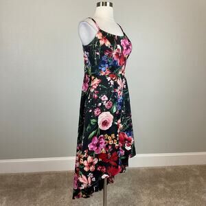 ~Sleeveless ~ Adjustable shoulder straps ~ Scoop neckline ~ High-low, mid-length hemline ~ Floral print satin fabric ~ Side inseam pockets ~ Padded bra cups ~ Concealed back zipper with hook and eye closure ~ Fully lined ~ Structured polyester