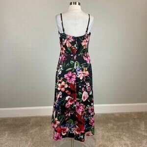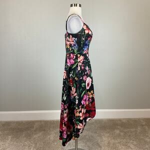XSCAPE Women's Cocktail Dress Size 6 Black Floral Print Satin High Low Midi Gown