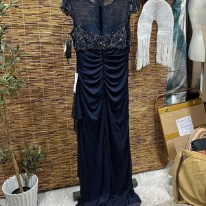 XSCAPE Womens Navy Embellished Zippered Keyhole Back Ruched Sheer Lined Cap Sleeve Crew Neck Full-Length