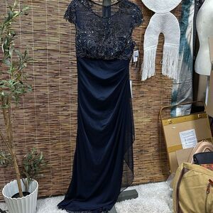 XSCAPE Womens Navy Embellished Zippered Keyhole Back Ruched Sheer Lined Cap Slee