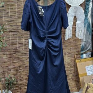 XSCAPE Womens Navy Zippered Gathered Scuba Draped Pouf Sleeve Jewel Neck Full-Le