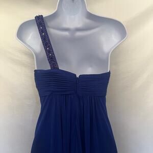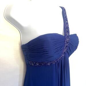 Royal Blue Xscape by Joanna Chen Full Length One Shoulder Gown with Crystal Asymmetric Strap with Crystals
