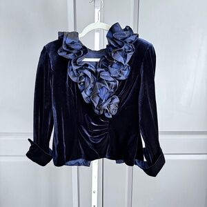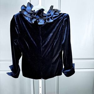 It's a navy blue velvet with navy ruffles they are navy too just look lighter in photo around the neckline, and zips up the back leaving a way to show off pretty little lace things you may choose to wear under.