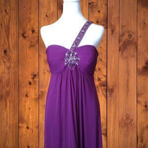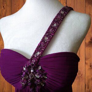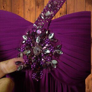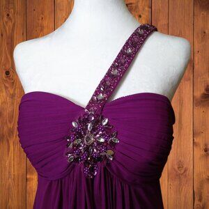 Xsape by Joanna Chen women's size 10P maxi dress is purple with zip closure in the back, one shoulder strap with beads and a medallion type cluster of beads on the chest.