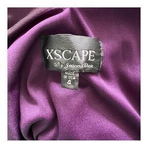 XSCAPE The dress has a halter neckline with a decorative ring at the top. It showcases an ombre color pattern, transitioning from dark purple at the top to a vibrant pink at the bottom. The dress has a loose, flowing silhouette with a blouson-style waist that creates a soft, gathered effect above the skirt. The fabric appears to be smooth and slightly shiny, adding an elegant touch to the overall design.