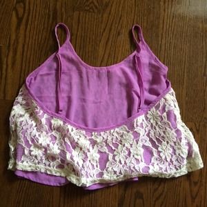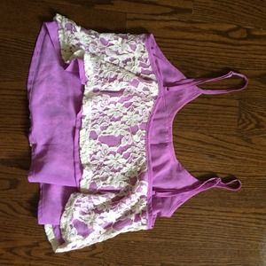 Super cute light weight purple tank with lace overlay. Adjustable straps for a low or high back. Crop fit. By Millau size Medium.