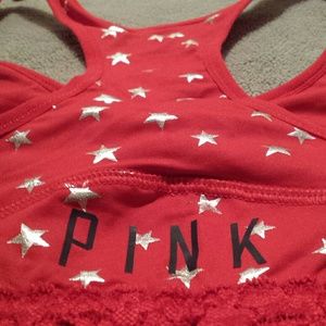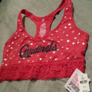This exclusive and rare Cardinals Sports bra by VS PINK is so cute! All of the stars are metallic and look amazing and none of the lettering is cracked. Racer back and stretchy material make this super comfortable.