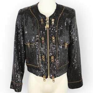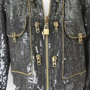 JACKET: Talon zippers & pulls - full front zip - long sleeves - sequins silk - faux flap pockets -padded shoulders - fully lined in black silk - bolero style 1980s