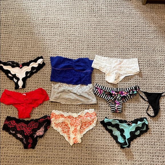 Includes eight sets of panties, and two Bandeaus. Everything in excellent condition. One of the panties still has tags on them. Mostly XS, with a couple Smalls. Brands are Free People, Victorias Secret, and Calvin Klein.