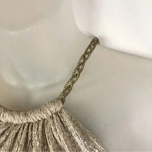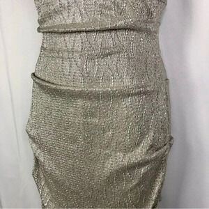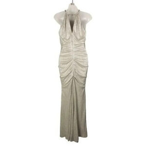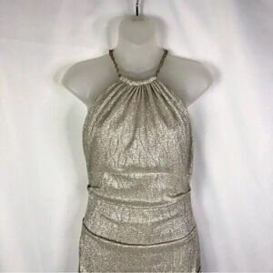 XScape High Neck Halter Metallic Champagne Ruched Formal Gown 4