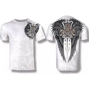 XTREME COUTURE by AFFLICTION Men T-Shirt ORTHODOX Skull WINGS Biker Gym $40 BRAND: AFFLICTION COLOR: BLACK, BLUE, GREY STYLE: ORTHODOX MATERIAL: 100% COTTON DETAIL: CREW NECK SHIRT, PRINTED IN FRONT & BACK, DESIGN IN USA, COUNTRY OF MANUFACTURE: USA