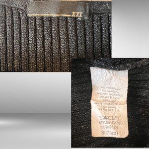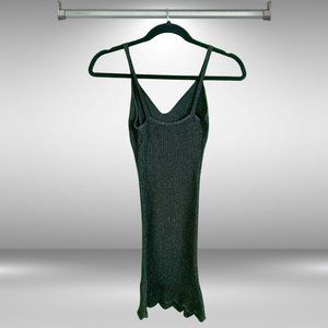 This is a bodycon tank top that could be worn as a dress on someone shorter than 5'6". It is made from black and silver glitter thread with textured patterns throughout. It has a scalloped hem and is really cute for a night out.