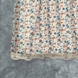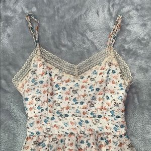 Cream colored dress with pink, blue and brown floral pattern. Lace detail at hem and neck. Size S. Adjustable straps and hidden side zipper. Ties in back around waist. Lined on the inside. Like new condition, no signs of wear. Waist is about 13” across laying flat. Waist to hem is 18.5” in length.