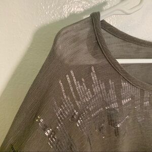 Great condition. XXI Forever 21. Long sleeve top. Scoop neck. Olive green color with silver sequin pattern. Raglan sleeves. Semi-sheer. Size medium. Stretch 65% polyester, 21% rayon, 4% spandex. Pit to pit laying flat 24” Shoulder to hem (front/back) 23”/27” Sleeve (pit to hem) 20”. All measurements are approximate and taken lying flat. Smoke free home. No trades, offers welcome.