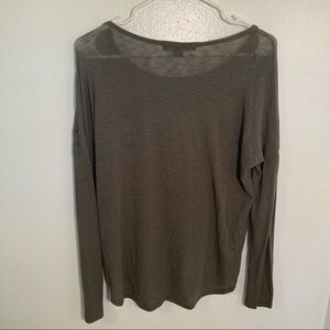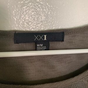 Great condition. XXI Forever 21. Long sleeve top. Scoop neck. Olive green color with silver sequin pattern. Raglan sleeves. Semi-sheer. Size medium. Stretch 65% polyester, 21% rayon, 4% spandex. Pit to pit laying flat 24” Shoulder to hem (front/back) 23”/27” Sleeve (pit to hem) 20”. All measurements are approximate and taken lying flat. Smoke free home. No trades, offers welcome.
