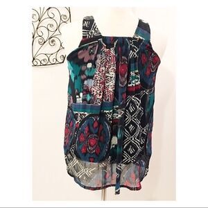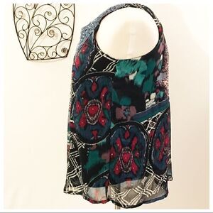 Super cute multi colored and patterned chiffon tank top. Rounded neckline with steel BKE embroidered flower like design with bead in the center. Completely lined