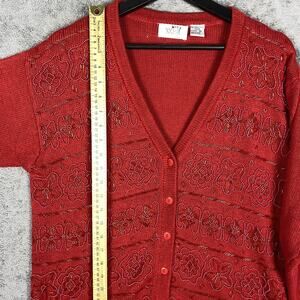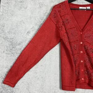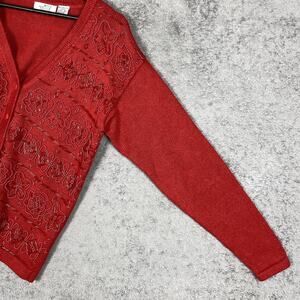 XXIst Cardigan Sweater Womens Small Red Beaded Floral Button Front Knit