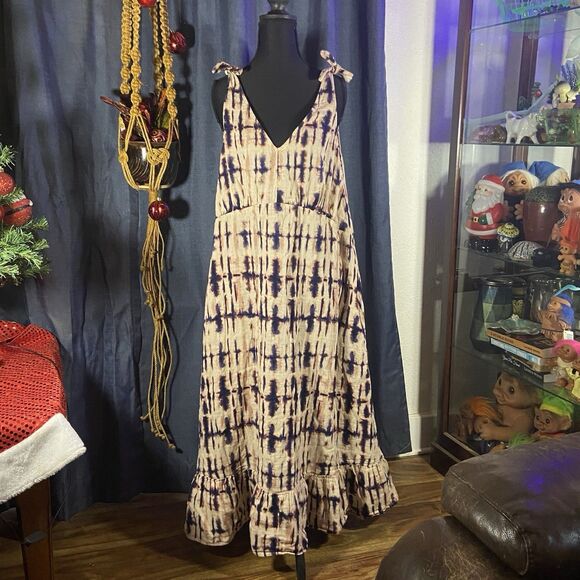 This XXL Boho Maxi Dress in a tie-dye Shibori design is perfect for the summer and spring seasons. The sleeveless dress features a V-neckline and a pullover closure for easy wear. Made from polyester, the long dress also includes convenient pockets for added functionality. With a bohemian theme, this multicolored maxi dress from Time And Tru is ideal for casual occasions and can be machine washed for easy care.