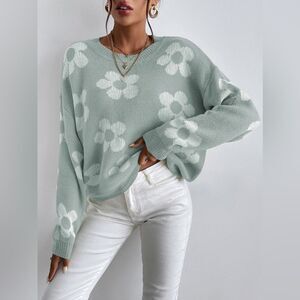 XXL Floral Pattern Sweater/Crewneck Long Sleeve Pullover,Y2K,Mint Green