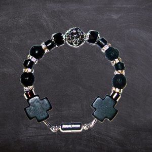 Newly handcrafted for our Pour Homme Collection, this 10 inch extra long loose fit mens bracelet is constructed of black lava rocks and crystal spacer beads, with a silver lion head center piece. Embellished with stone cross pieces. Magnetic barrel closure. Silver snake chain for flexible fit. Hypoallergenic; lead and nickel free. Complimentary gift with purchase!