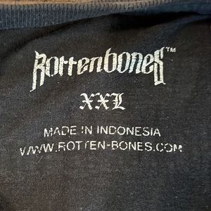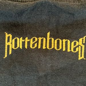 Rotten bones logo tee with skull shield on front & logo tags at bottom hem. Slight distressed and super soft vintage feel!
