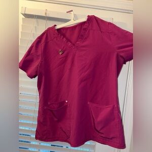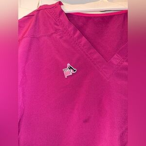 Comfortable Scrubstar pink scrub top with two front pockets. Ideal for healthcare professionals. Scrubstar size XXL, comes with pin shown. Small stain pictured here. Very form fitting and flattering, comes from a smoke free and pet free environment. 🚭